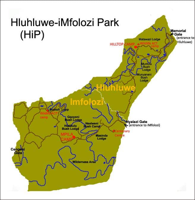 I due campi principali sono Mpila a sud (Imfolozi) e Hilltop a nord (Hluhluwe). Ma solo quest’ultimo dispone di un ristorante. Peraltro, tutti gli chalet dispongono di cucinino completamente corredato e angolo bbq. In entrambi i campi si trovano piccoli spacci alimentari.